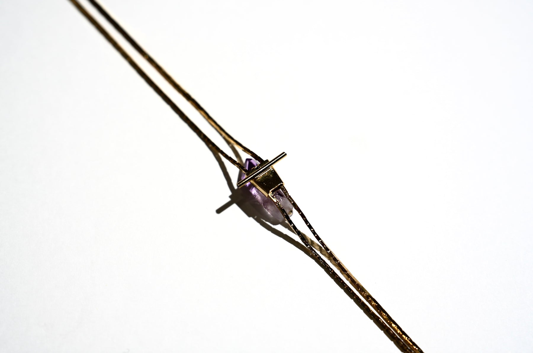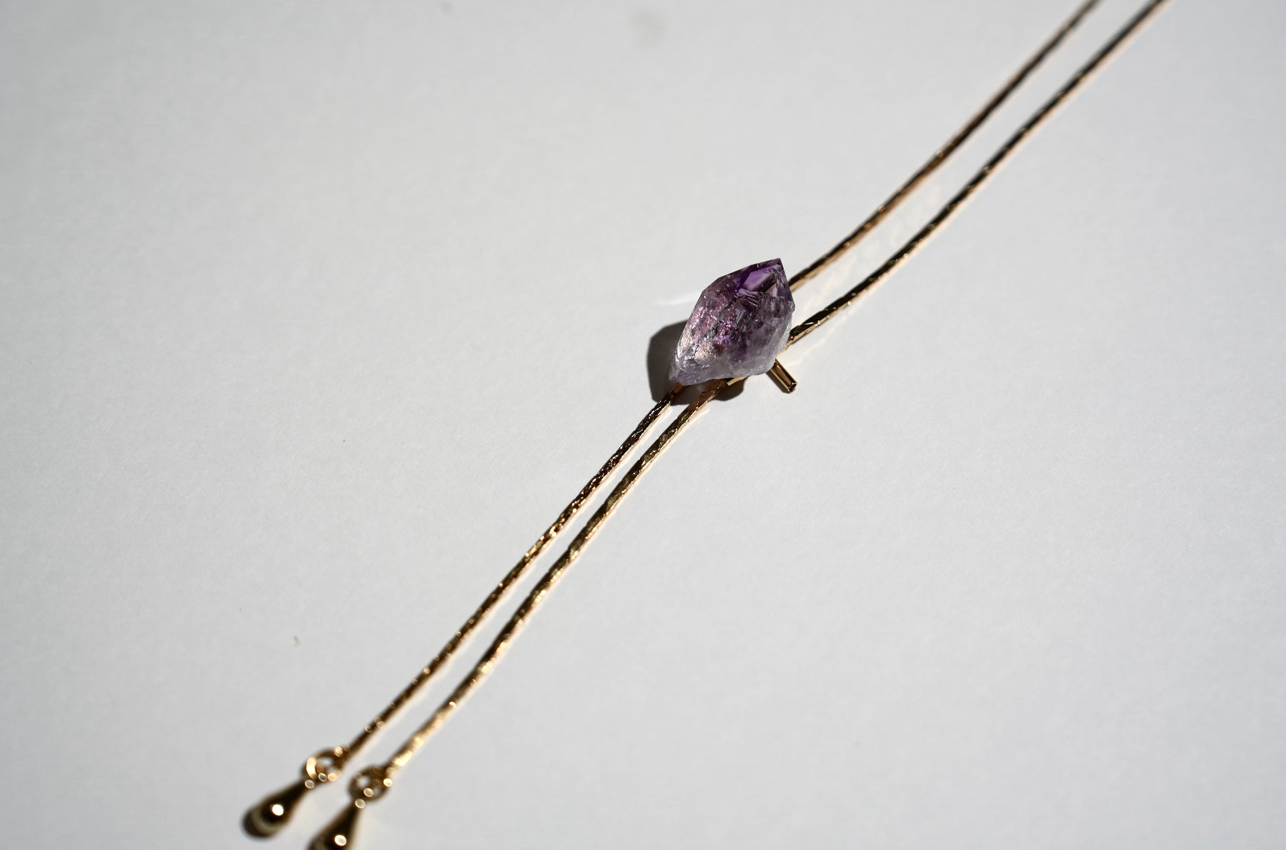 Amethyst soft lavender to deep violet colours bring a sense of calm into your energy field. Once you're in a calm state, that's when you can really tap into your intuition. The vintage gold-plated chain slides like a true bolo, so you can wear it high and sharp or low and drapey. Intentionally simple, quietly bold, and easy with everything from knits to slip dresses. Each stone is intuitively handpicked for its feel and set on a vintage chain, keeping it one-of-one and low-waste.
