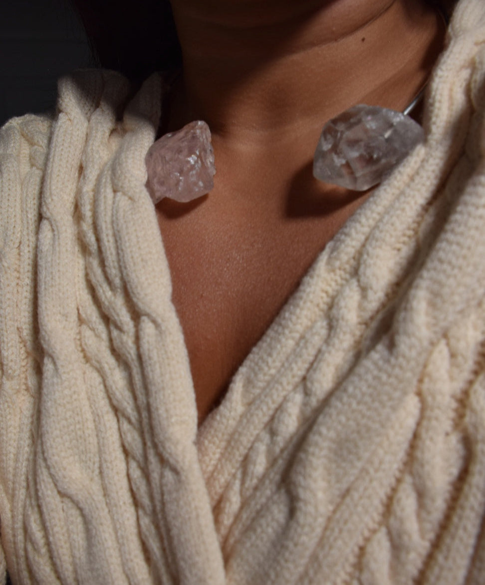 IN THE NAME OF LOVE. We keep hearing “love yourself, love yourself,” and in your head you’re yelling, “I’m trying, just give me a minute!” Love is circuitry: what you send inward radiates back through everything: relationships, career, health, and most importantly, your mind. Need a little help? Rose Quartz connects you to that soft, gracious, loving, powerful feeling already inside. A Clear Quartz point acts as an amplifier, directing clarity into the Rose Quartz to enhance those warm feelings of Love. Paired on purpose, they make self-love feel less theoretical and more embodied. Each stone is intuitively handpicked by our designer for the energy it carries and crafted in small, mindful quantities so your piece feels unique to you!